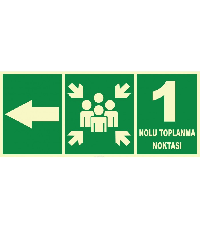 Fosforlu Acil Toplanma Noktası Sol Yön İşareti Levhası: Karanlıkta bile yönlendirme sağlayan yüksek kaliteli 3 mm dekota PVC. Güvenliğinizi hızla sağlayın, hemen sipariş verin!