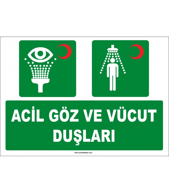ISO 7010 Acil Göz ve Vücut Duşları levhası: Güvenlik ve ilk yardım için TSE standartlarında, 3 mm PVC malzemeden hemen sipariş verin!